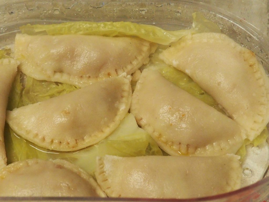 Aqui estão os ravioli em espiga enquanto cozinham na vaporiera.