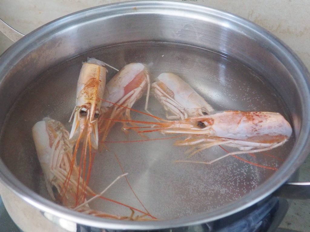 Coloque em uma panela cerca de dois litros de água, adicione 4/5 cabeças de camarões, três colheres de chá cheias de sal e leve para ferver.
