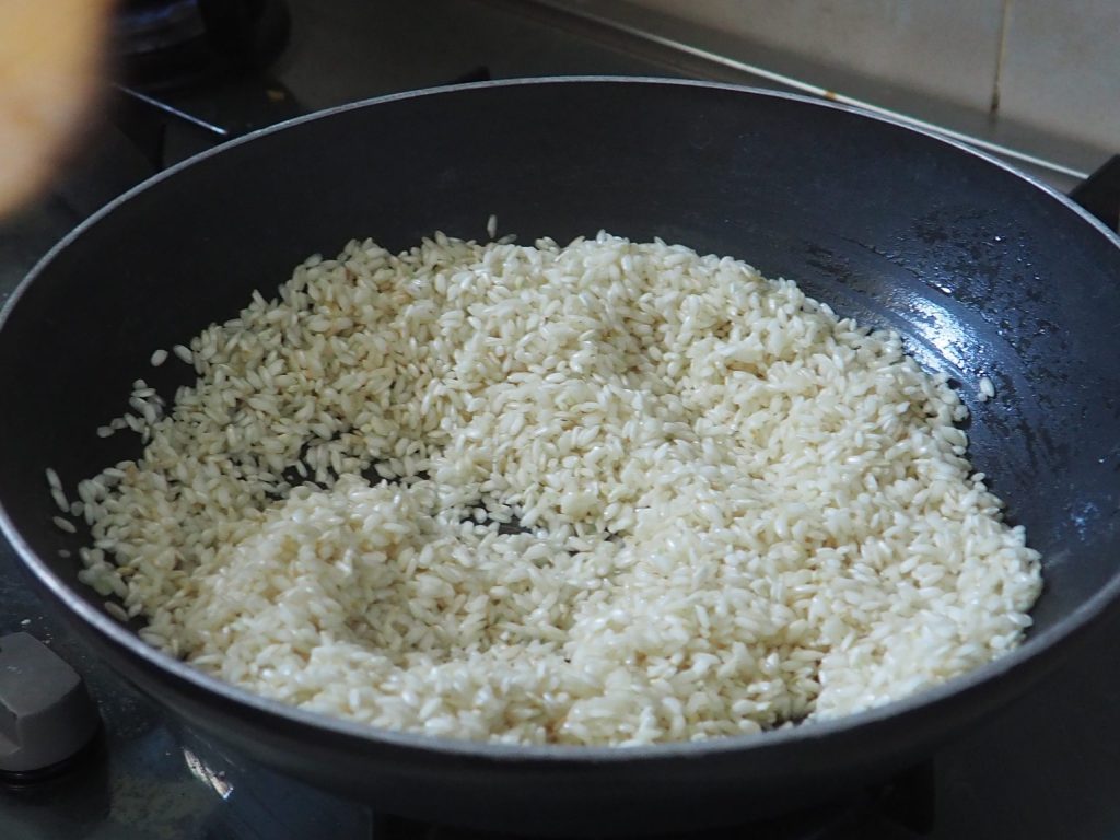 Em uma wok, toste o arroz com duas colheres de sopa de óleo.