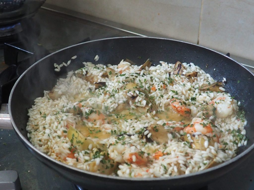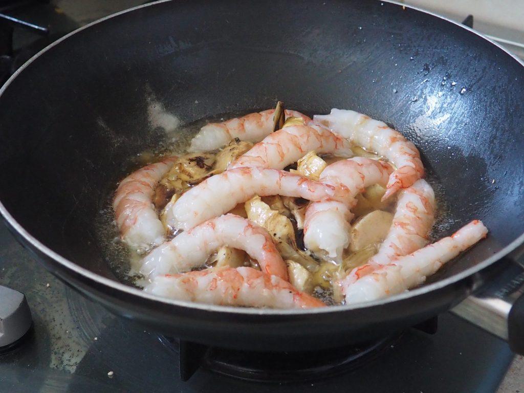 Você também pode não tostar o arroz e colocá-lo diretamente na panela com as alcachofras e os camarões.