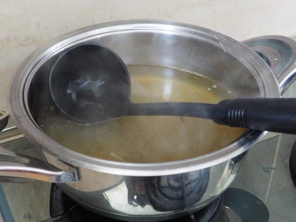 Em uma panela, aqueça o caldo de carne fervido com água (alternativamente você pode preparar o caldo com um cubo)
