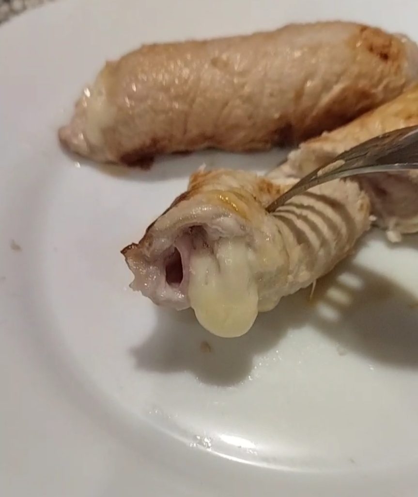 Em uma frigideira antiaderente, coloque os rolinhos de lombo. Obtivemos oito rolinhos.