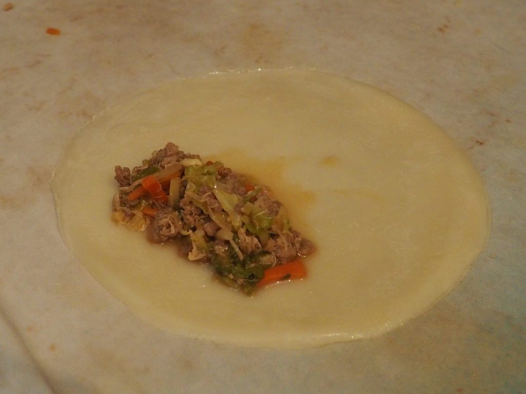 Enrole a parte inferior para fechar o recheio, dobre os dois lados, colocando um pouco de massa que servirá como cola.