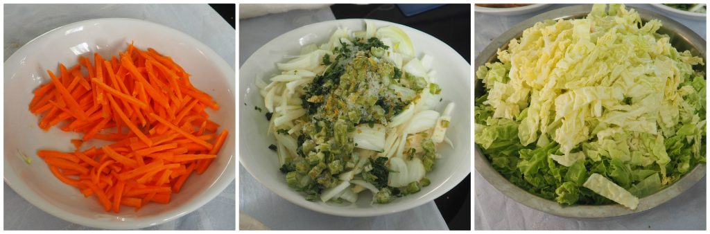 Prepare o recheio começando por lavar, cortar em tiras as cenouras, cebolas, aipo e o repolho.