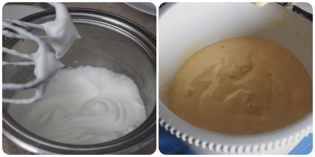 • À parte, bata as claras com uma pitada de sal. Quando estiverem firmes, adicione-as à massa de farinha, mexendo delicadamente com uma espátula.