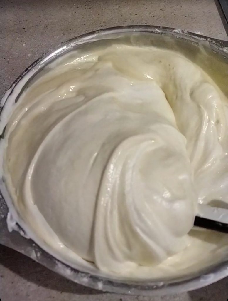 Agora adicione as claras em neve à mistura de gemas e farinha, mexa delicadamente com uma espátula.