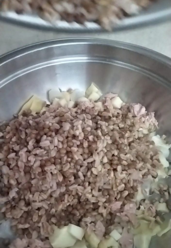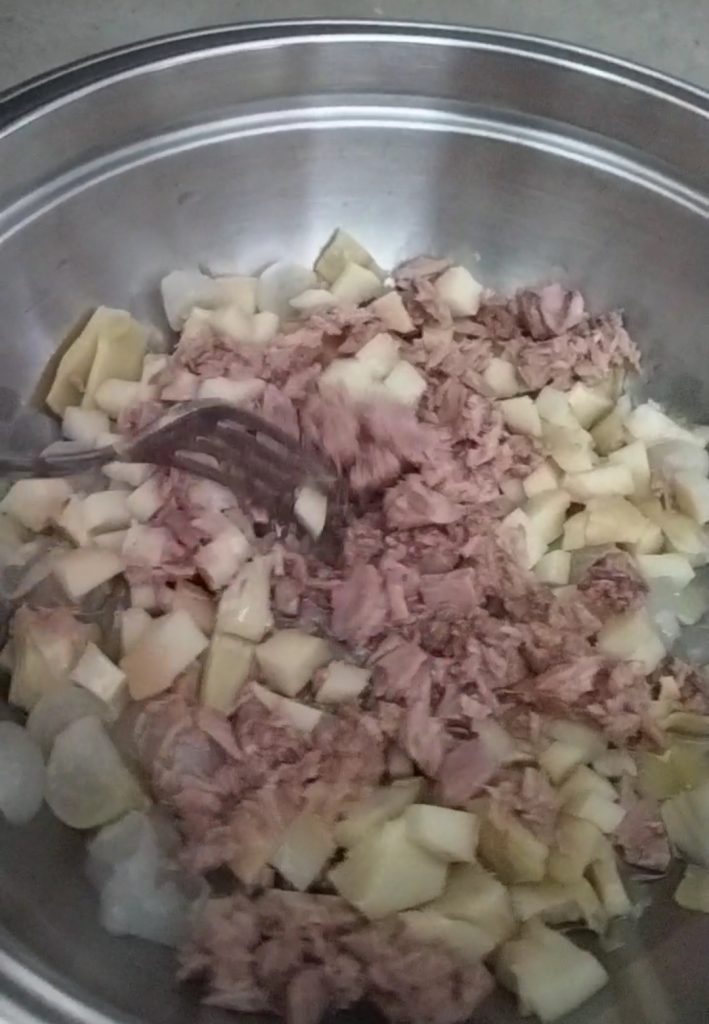 Adicione duas latas de atum, se preferir mais saboroso, pode adicionar uma a mais.