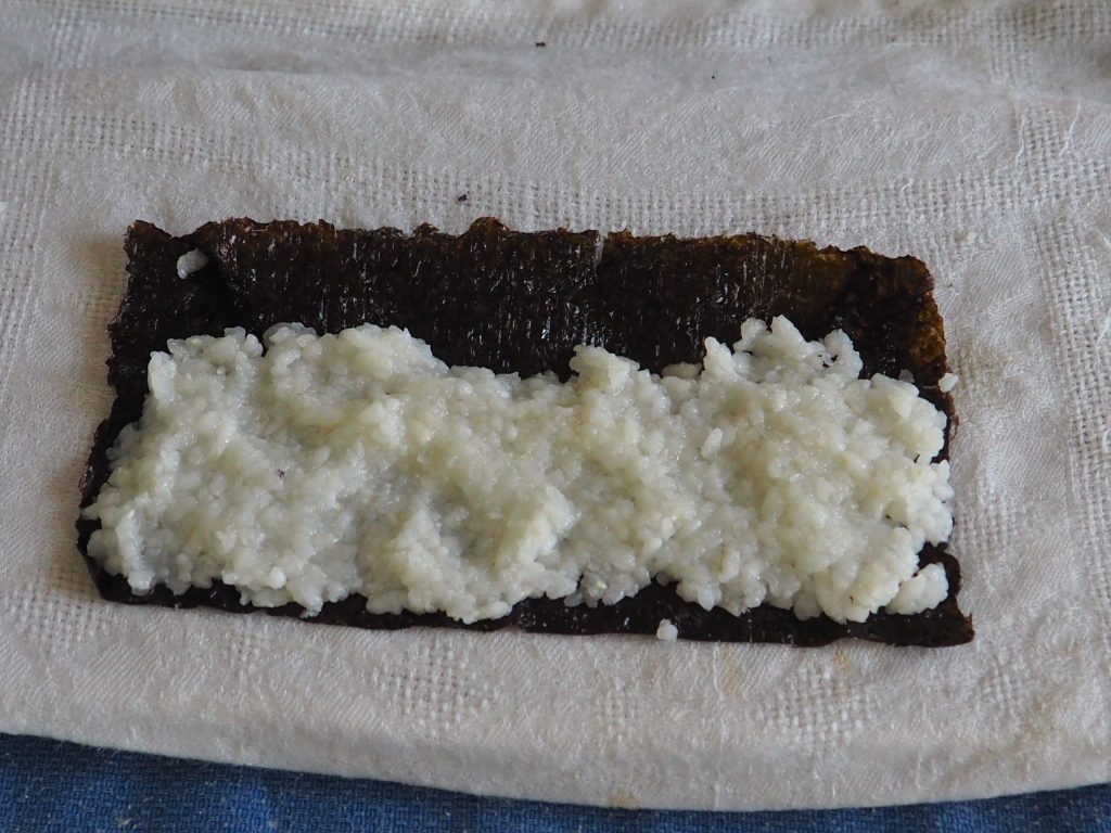 Pegue uma folha de alga (tamanho aprox. 18×21 cm, peso cada uma 2,5 g) e corte ao meio. Coloque sobre um pano levemente úmido (melhor se você tiver a esteira de bambu apropriada).
