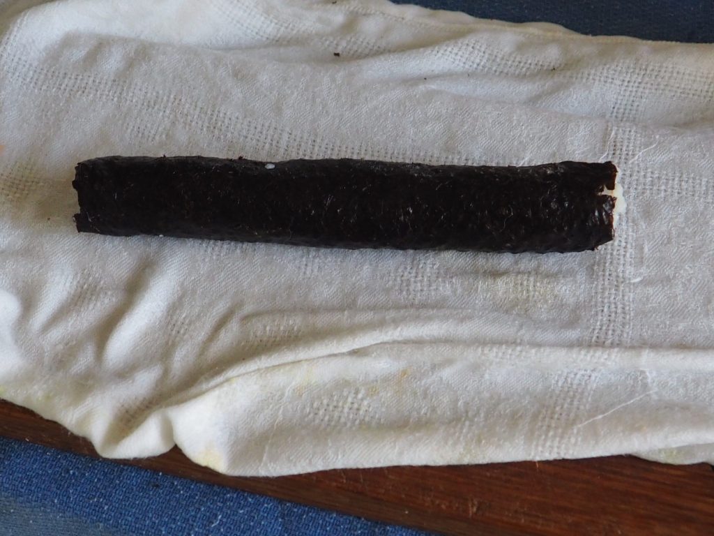 Molhe com um pouco de água e vinagre a parte superior da alga e, ajudando-se com o pano (se você tiver a esteira, este procedimento será facilitado), enrole a alga até obter um pequeno cilindro.