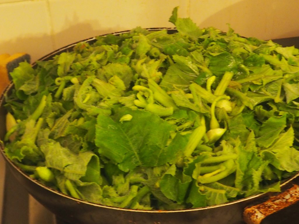 Adicione os talas de abóbora na panela, cubra e cozinhe por alguns minutos. Isso para fazê-los murchar levemente. Você verá o quanto eles vão reduzir durante o cozimento.