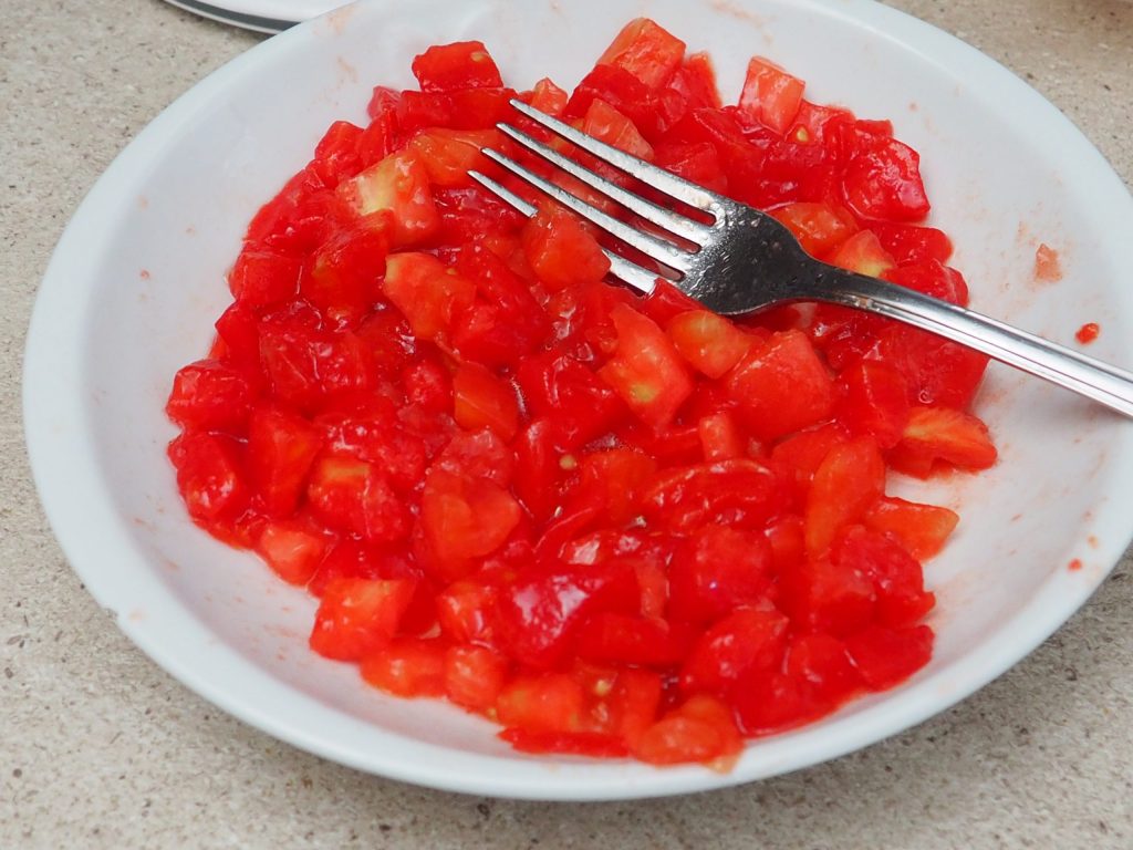 • Comece a preparar os ingredientes: lave os tomates, retire a pele e as sementes, corte-os em cubinhos bem pequenos.