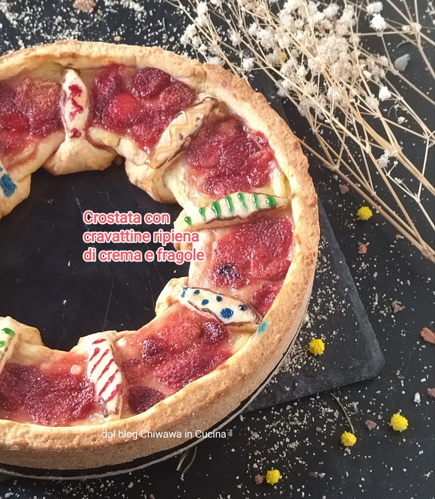 A Torta com gravatinhas recheada com creme e morangos é um docinho que você pode propor para o Dia dos Pais, uma maneira de fazê-lo entender que você sempre pensa nele e para agradecê-lo por tudo que faz por você. Eu coloquei os morangos para cozinhar, já que estavam congelados, mas você também pode usar os frescos, então adicione-os depois de cozinhar.