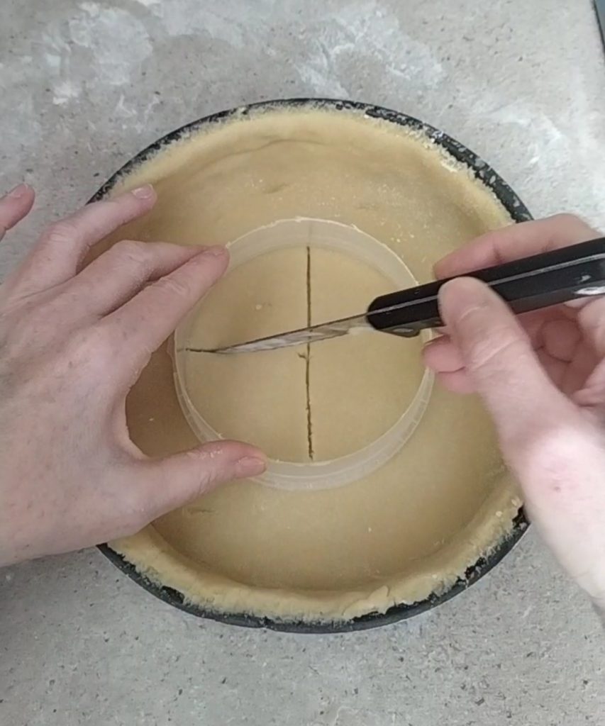 Posicione um cortador de biscoitos no centro da forma, para ter uma referência sobre o comprimento do lado do triângulo. Com uma faca, recorte oito triangulinhos do centro para fora.