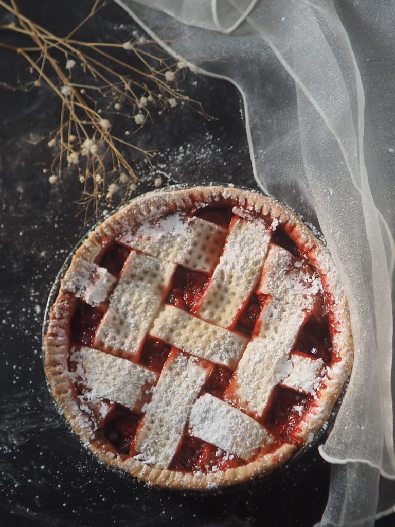 Coloque as tiras sobre os morangos, cruzando-as, e com o cordão, decore a borda da torta. Com um garfo, faça um desenho na borda da torta. Asse a 180° por cerca de 40 minutos.