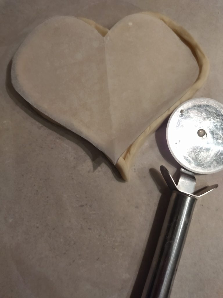 • Estenda a massa com um rolo até uma espessura de cerca de 5-6 mm, para ter a mesma altura, use dois hashis nas bordas da massa enquanto a estende. Recorte em papel manteiga corações de aproximadamente 16 cm de largura e 12 cm de altura, conforme a figura. Eu os preparei à mão, de fato dá para ver que não são perfeitos!