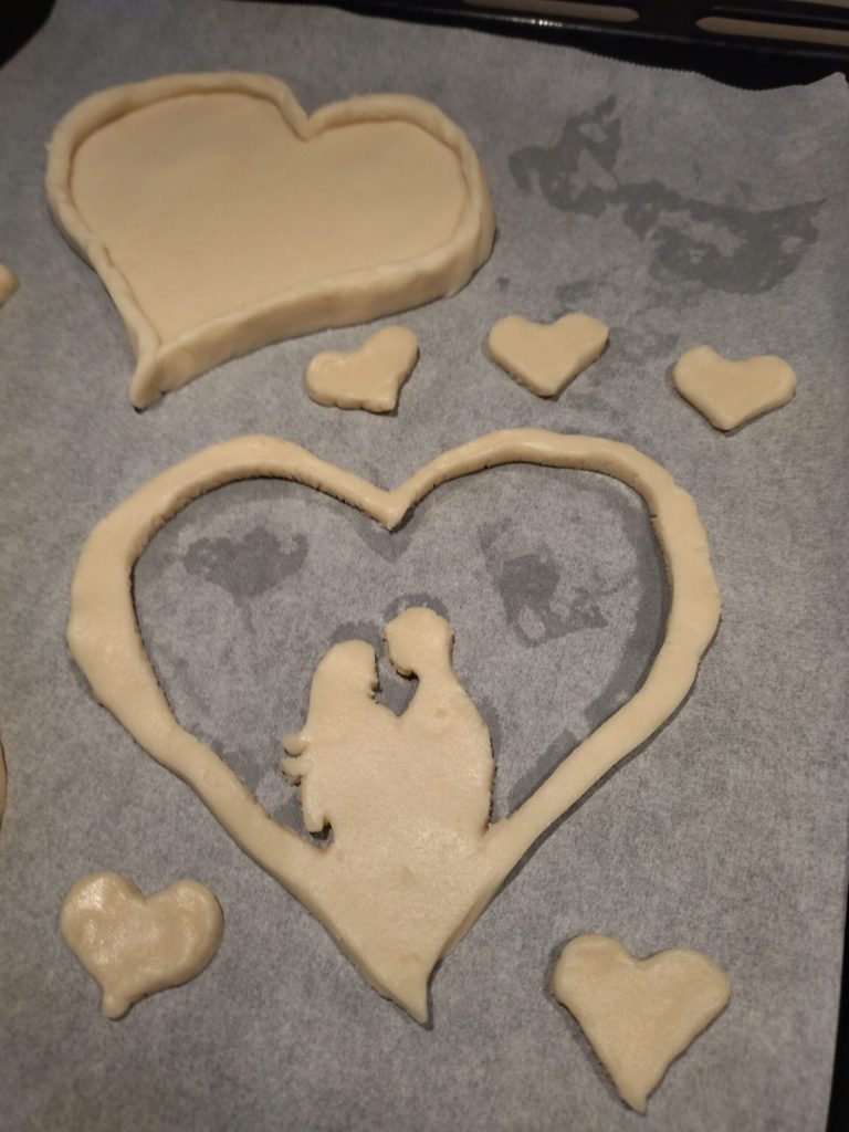 • Com o restante, faça coraçõezinhos que você usará para finalizar a figura. Asse a 140° por cerca de 30/35 minutos. A base que é ligeiramente mais espessa pode ser deixada por mais 5-10 minutos, enquanto os biscoitos que são menores podem ser deixados alguns minutos a menos. Verifique quando estiverem dourados, estarão prontos.