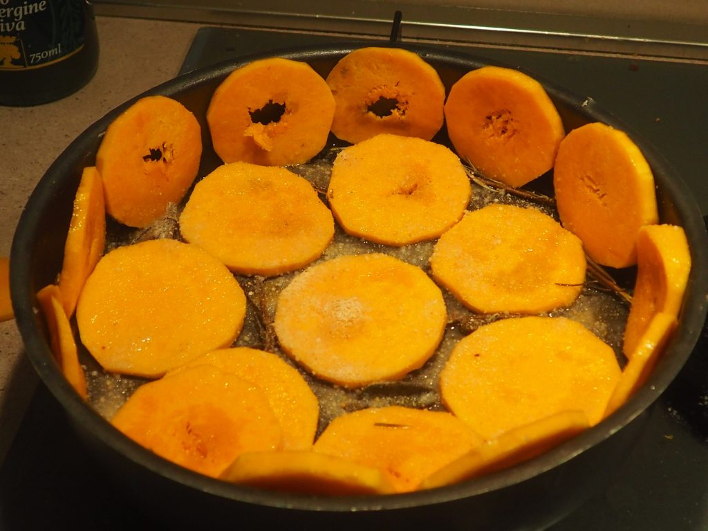 Lave, descasque a abóbora com um descascador de legumes e corte-a em fatias de cerca de meio centímetro de espessura (as minhas fatias têm um diâmetro de cerca de 5/6 centímetros).