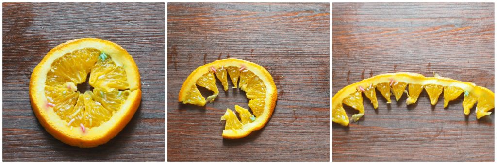 Fatie finamente uma laranja, pegue uma fatia, corte a casca em um ponto e estique (como na foto).