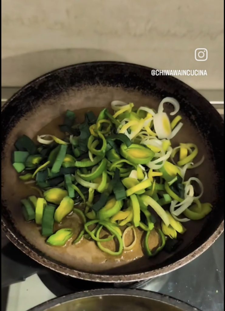 • Lave, limpe e corte finamente o alho-poró. Numa frigideira, refogue com um pouco de azeite. Depois reserve.