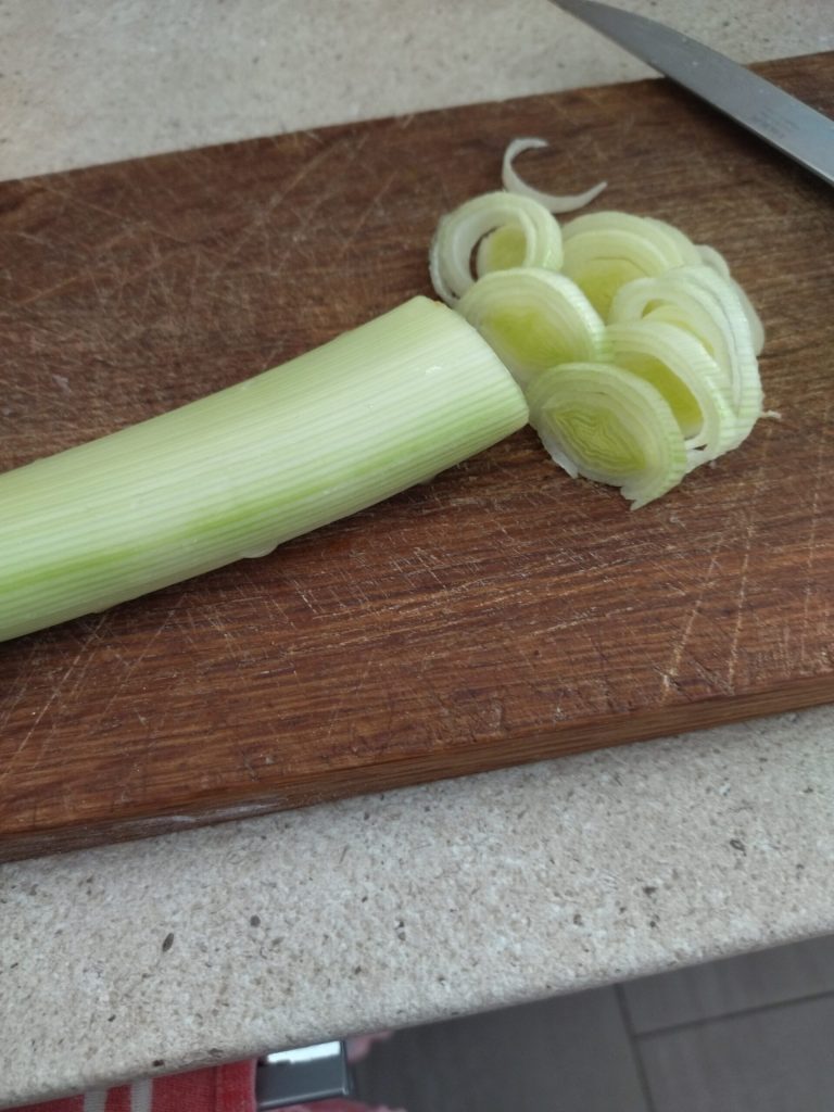 • Em uma panela grande, coloque 20 g de manteiga e o alho-poró, refogue por cerca de 10 minutos, salgue e misture. O alho-poró deve estar bem cozido. Enquanto isso, prepare o caldo, aquecendo um litro de água com um cubo de caldo de carne.