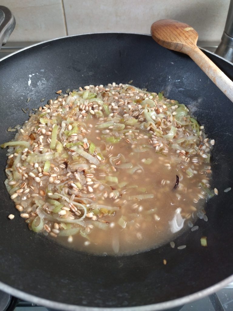 • Adicione o Trio de Cereais na panela com o alho-poró refogado, deixe torrar por alguns segundos.