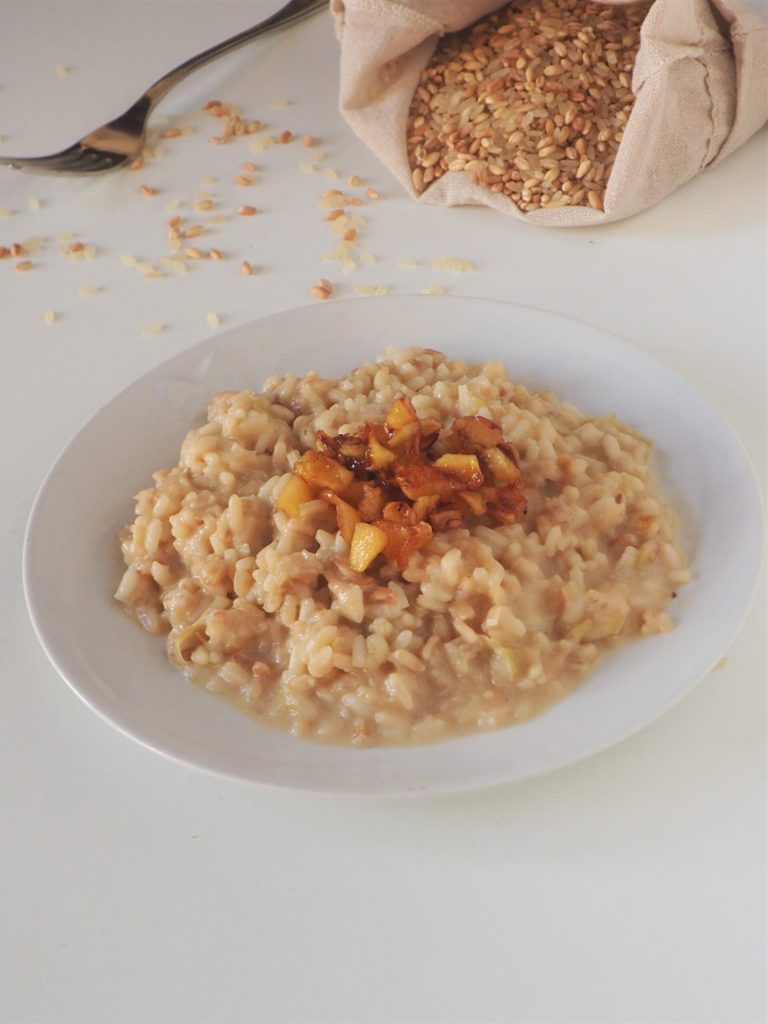 Trio de cereais com pannerone, alho-poró e maçã caramelizada