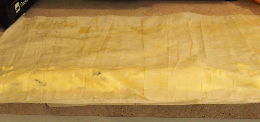 Pegue agora uma folha de massa filo e coloque-a sobre uma superfície com a parte mais longa voltada para você.