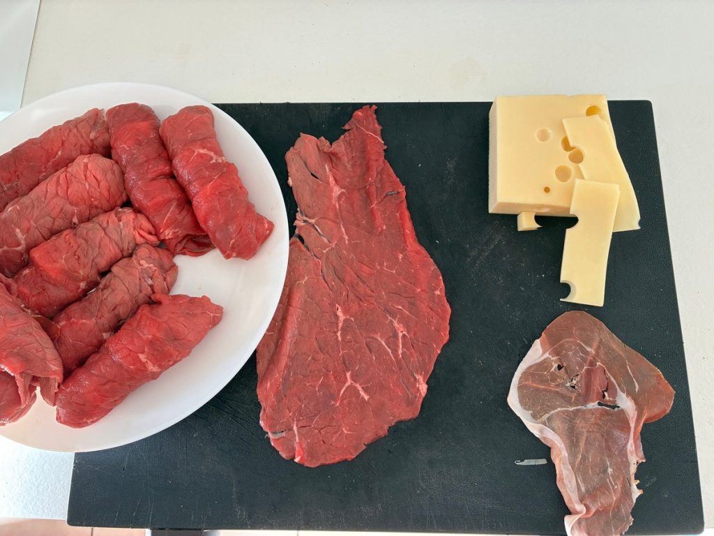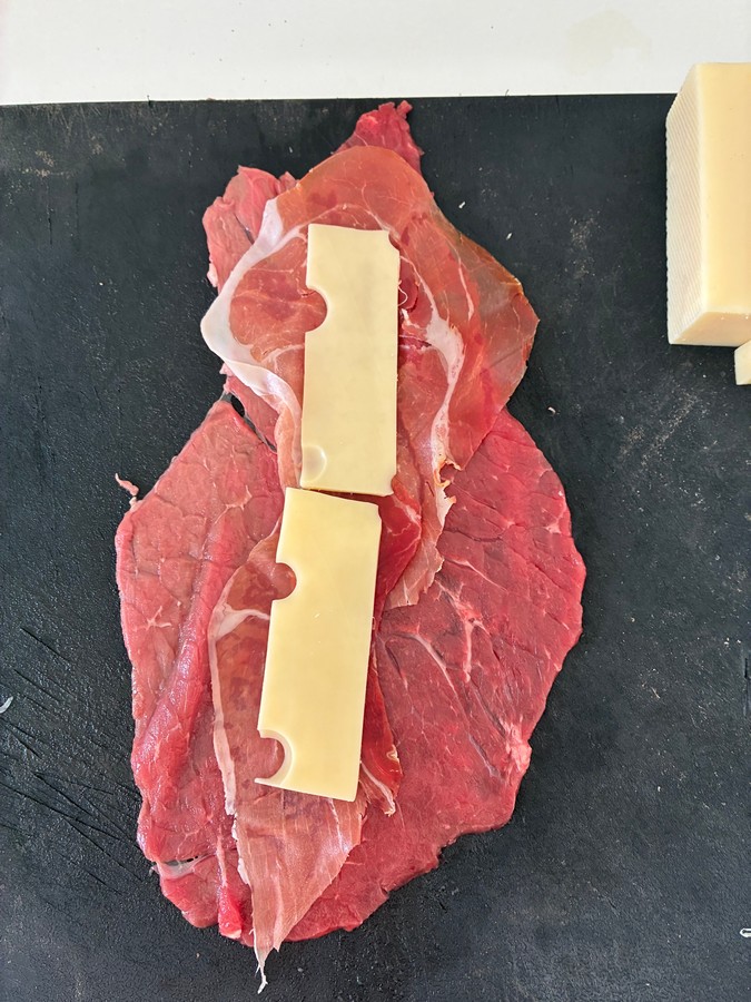 Peça ao açougueiro para cortar as fatias de vitela bem fininhas e disponha-as sobre uma superfície. Corte o Emmental bem fino, pois ele deve ser enrolado junto com a carne. Coloque em cada fatia de carne uma fatia de presunto cru, depois o queijo, e enrole tudo.