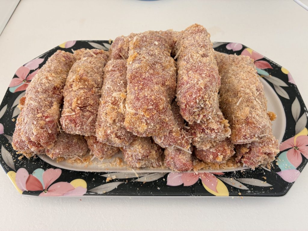 Passe cada rocambole primeiro no ovo e depois na empanagem, dispondo-os um a um em uma assadeira previamente untada. Quando todos estiverem empanados e bem organizados na assadeira, regue com azeite extravirgem e leve ao forno por 20 minutos a 180°C em forno ventilado, ou 30 minutos em forno convencional. Deixe repousar 5 minutos antes de servir com acompanhamento de batatas arrianate!