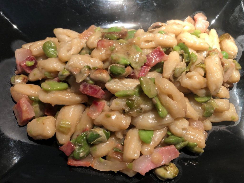 Guanciale e favas são um prato típico da primavera, vamos adicionar uns cavatelli cilentanos feitos simplesmente com água e farinha e teremos uma explosão de sabores. Guanciale ‘caseiro’ e favas recém-colhidas são o must da cozinha camponesa e nós simplesmente os exaltamos.