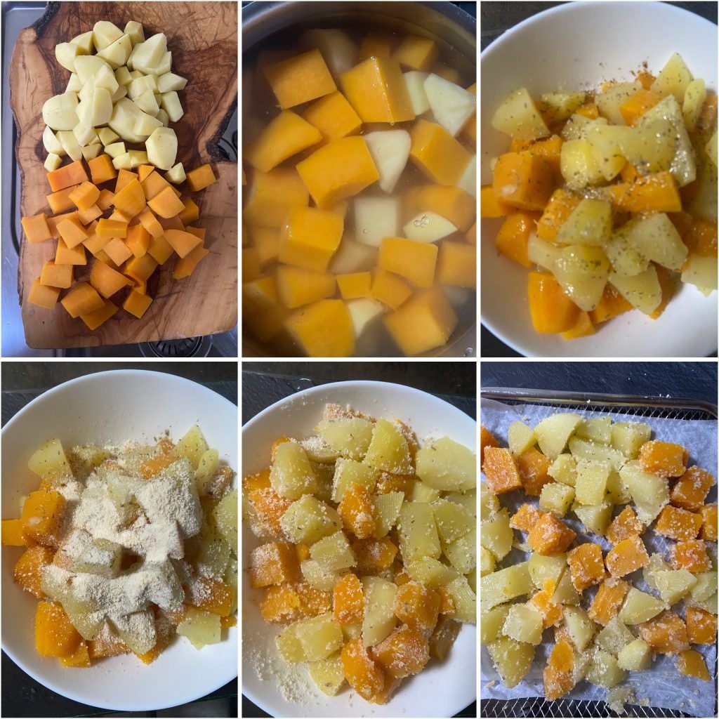 Abóbora e batatas gratinadas. Um acompanhamento preparado na fritadeira elétrica, saudável e saboroso que vai surpreender tanto os adultos quanto as crianças. Geralmente preparo um pouco a mais para poder levar para o almoço no escritório.