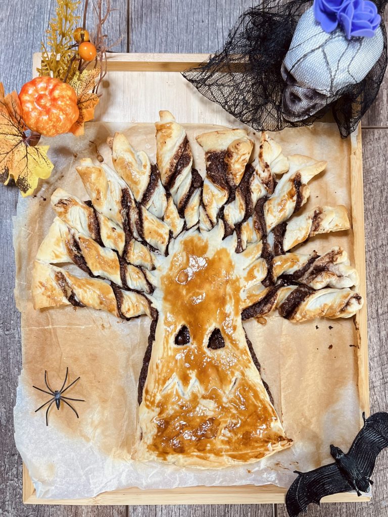 Árvore de Halloween de massa folhada. Um doce delicioso, mas particularmente cenográfico, perfeito para enriquecer o lanche de Halloween.