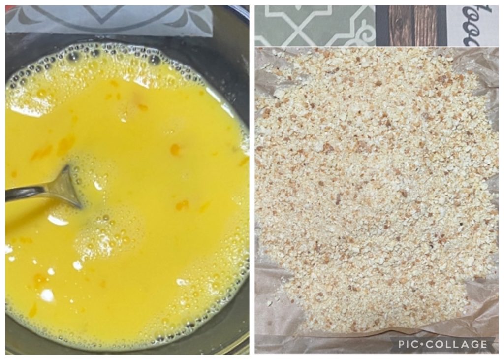 Mergulhe as fatias de berinjela nos ovos batidos e depois passe ambos os lados na farinha de rosca.