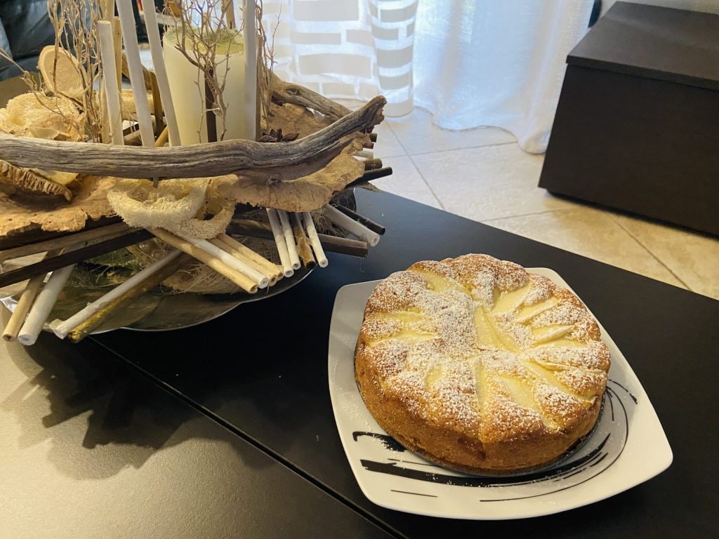 Descascamos a maçã reservada, cortamos em fatias e as dispomos em forma de espiral sobre o bolo.