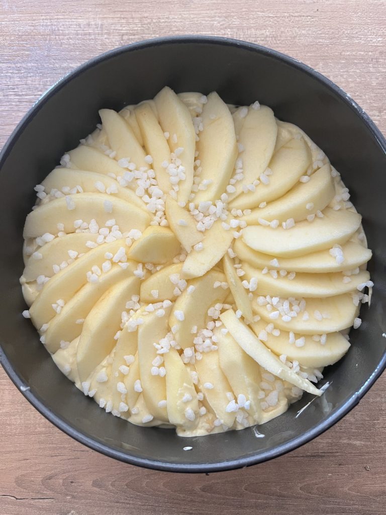 Decore a superfície com as fatias de maçã dispostas em círculo e polvilhe com o granulado de açúcar