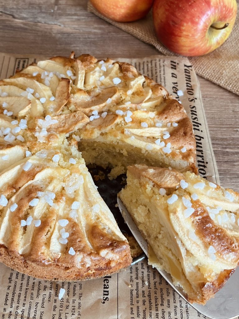 Nosso bolo de maçã macio está pronto. Deixe esfriar antes de servir e decore com granulado de açúcar.