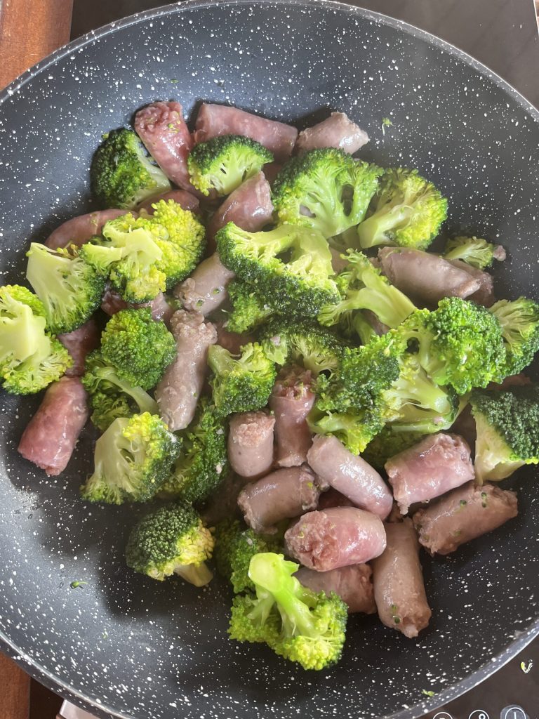 Nossos brócolis e linguiça na frigideira estão prontos.