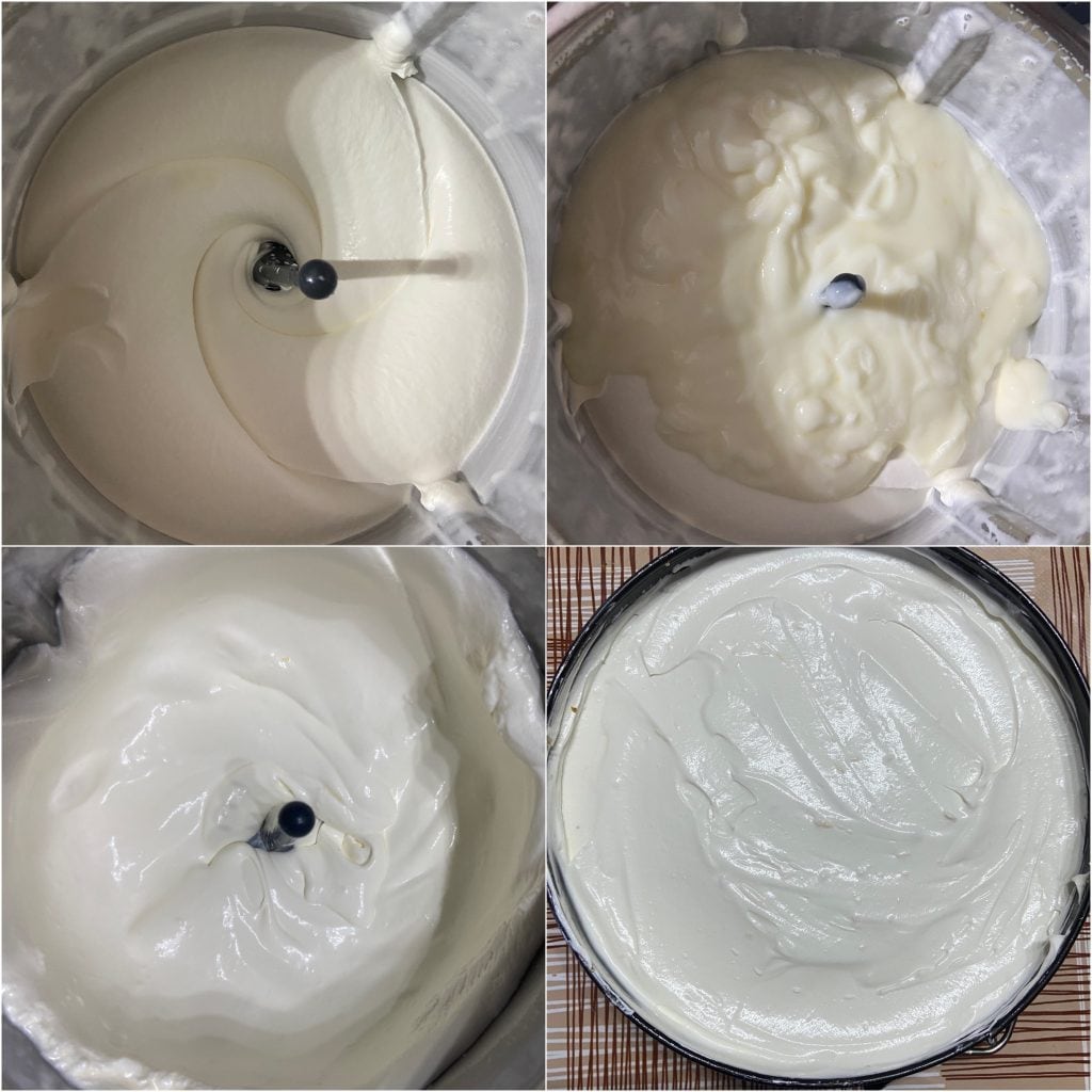 Misture bem e então despeje a mistura obtida na forma com a base de biscoitos.