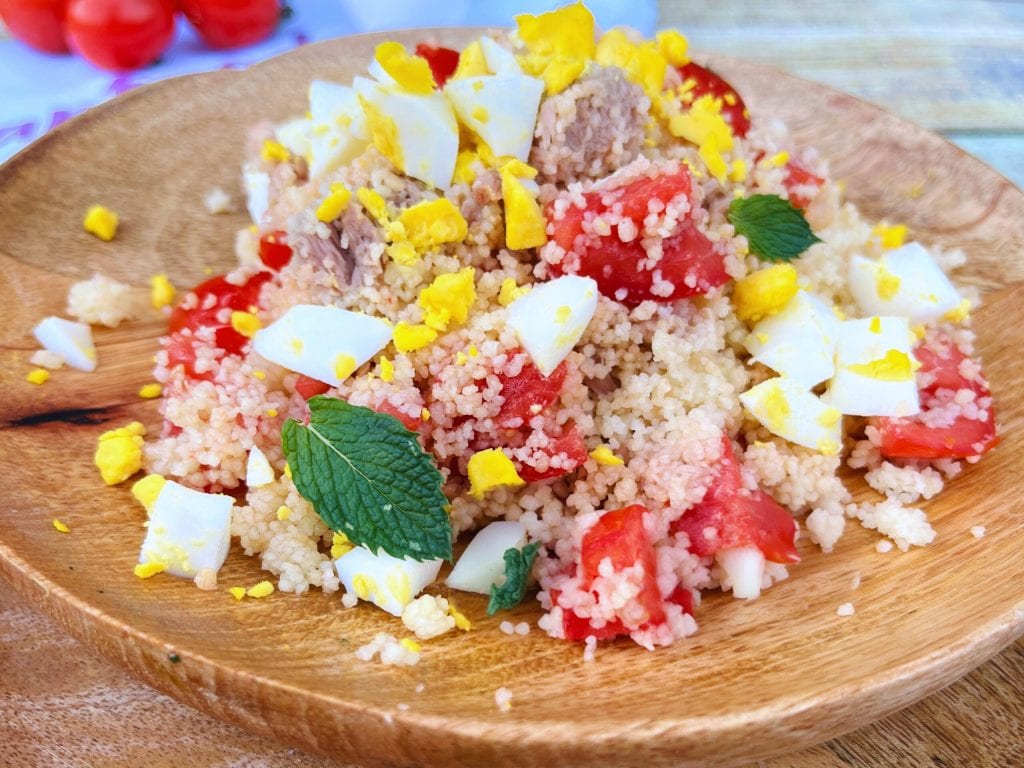 Hoje te proponho uma das minhas versões preferidas: cous cous com atum, ovos cozidos e tomatinhos. Um prato fresco, colorido e completo, perfeito para saborear até mesmo frio.