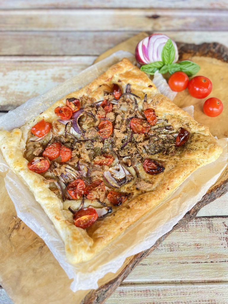 A folhadinha com atum cebolas e tomatinhos é um prato saboroso e versátil, perfeito para qualquer ocasião. Trata-se de uma torta salgada fácil e rápida de preparar, ideal tanto como entrada quanto como prato único.
