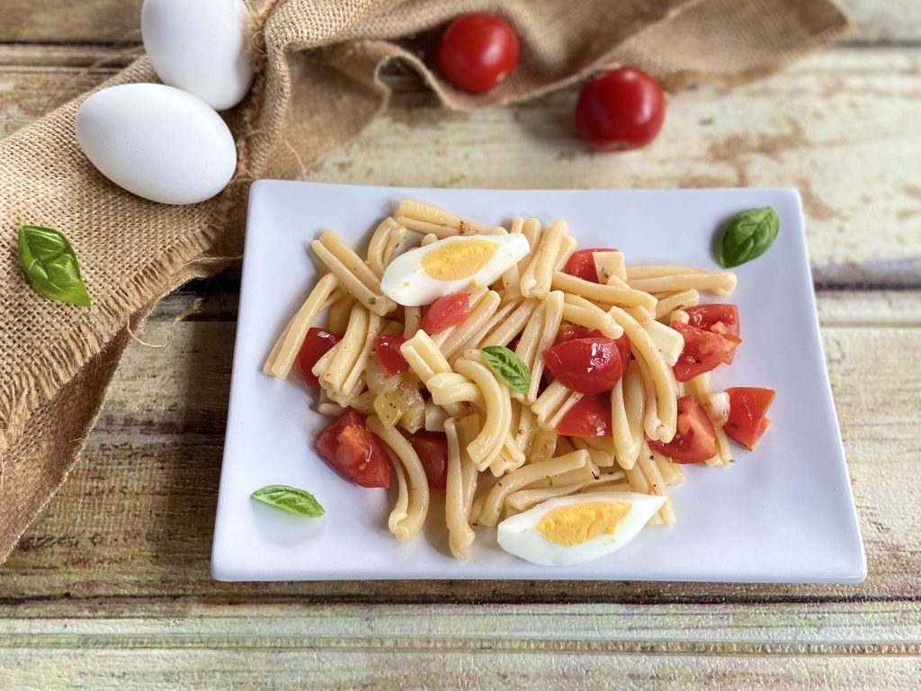 Colocamos as casarecce em uma tigela grande ou em uma assadeira. Adicionamos os tomatinhos, o emmenthal e os ovos cozidos. Temperamos com azeite extra virgem, sal, uma pitada de pimenta-do-reino e misturamos bem para combinar todos os ingredientes.