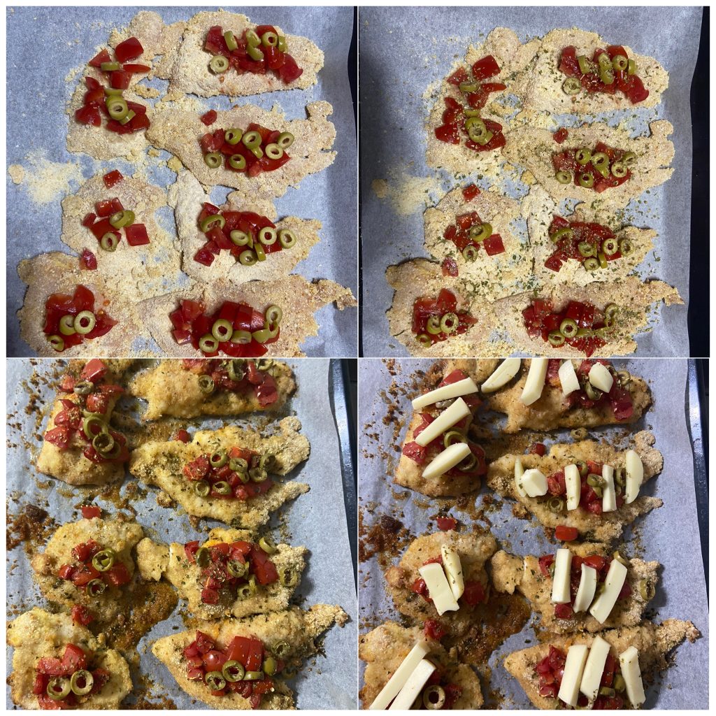 • Colocamos em cada fatia alguns tomatinhos, algumas azeitonas e temperamos com orégano, temperos para assado, sal e uma borrifada de azeite de oliva extravirgem.