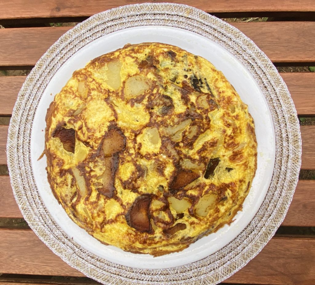 • Uma vez que as batatas estão cozidas, distribuímos uniformemente na frigideira e despejamos os ovos batidos por cima.