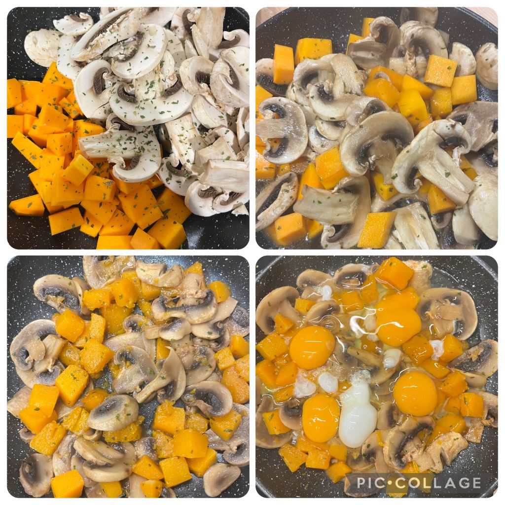 Ontem à noite eu não estava com vontade de cozinhar. Pensei: “Preparo dois ovos e pronto”, mas na geladeira eu tinha também um pedacinho de abóbora e cogumelos champignon. Assim, ao invés do prato rápido de sempre, nasceu esta frigideira colorida e perfumada, perfeita para o outono!