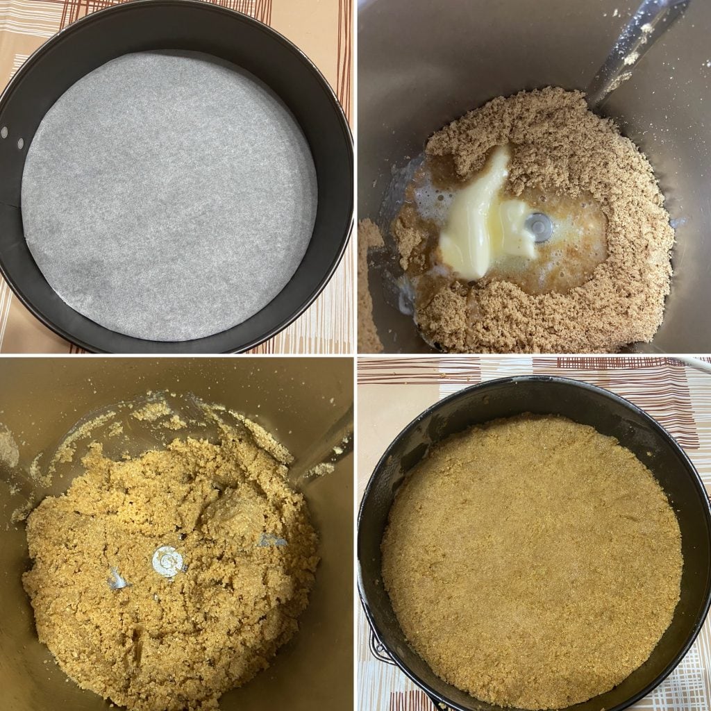 Derretemos a manteiga, juntamos aos biscoitos e misturamos até obter uma massa homogênea.