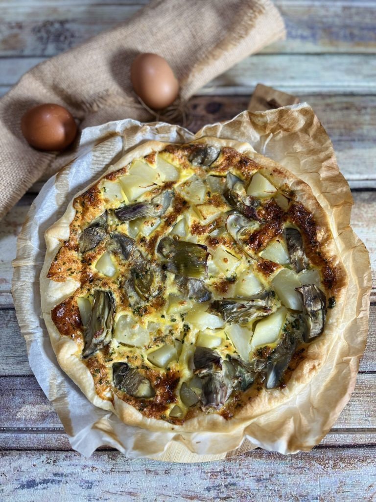 Torta salgada com alcachofras e batatas. Um prato simples e saboroso, ideal para um almoço leve, uma entrada rústica ou um aperitivo entre amigos.