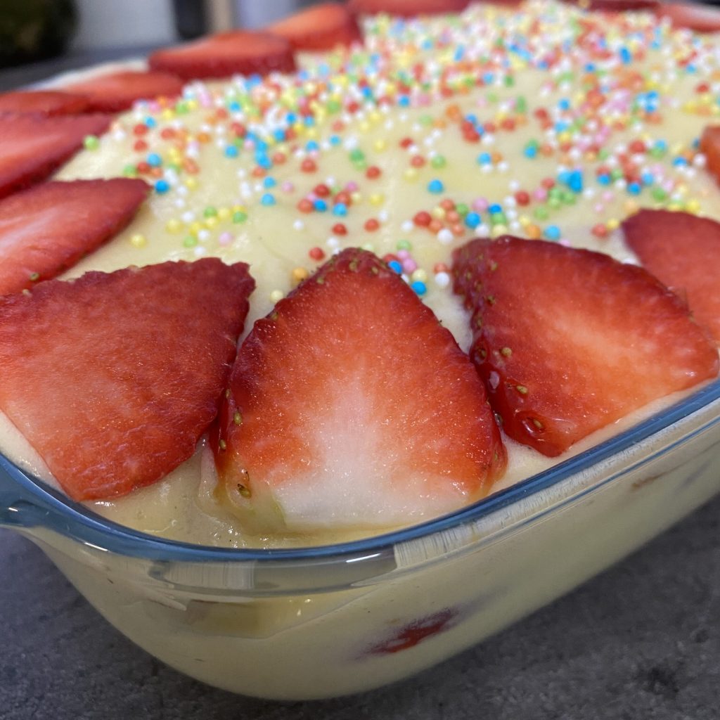 A realização foi muito simples, quase banal, pois bastava colocar os pedaços de massa folhada dentro de uma assadeira e depois alterná-los em várias camadas com a adição do creme de confeiteiro e os morangos fatiados. Finalmente, como última camada, decorei com mais morangos e um pouco de bolinhas coloridas de açúcar.