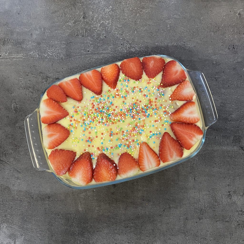 Neste ponto, cubra com o creme e adicione os morangos cortados em fatias mais ou menos finas