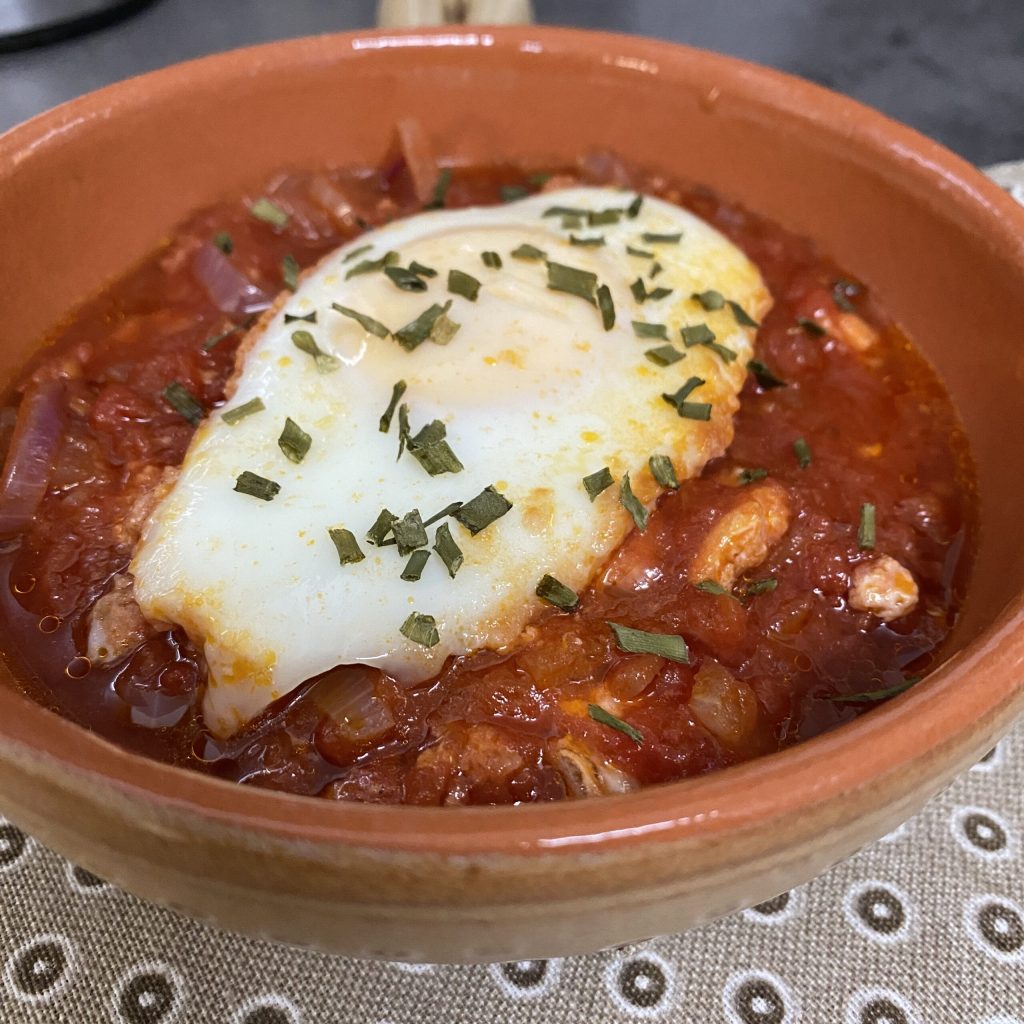 O protagonista é definitivamente o ovo, que cada um pode decidir cozinhar pelo tempo necessário para deixar a gema dura ou deixá-la líquida. Depois, somos envolvidos por um molho de polpa com bastante cebola que quase te obriga a comê-lo com pão.