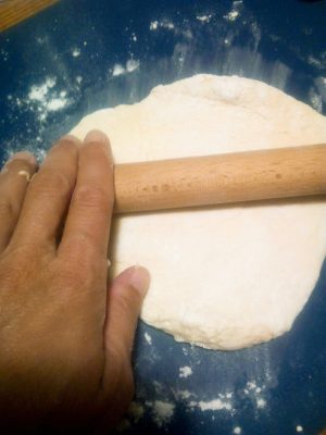Pegue pedaços de massa e abra com um rolo até uma espessura de 3-4mm